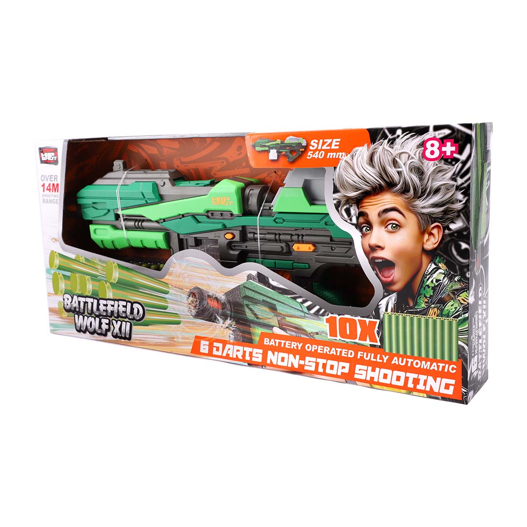 Battlefield Wolf XII, is fully automatic blaster is designed for engaging play offering smooth operation and easy handling. With a switch-operated automatic loading system and a compact magazine capacity, it allows for continuous and enjoyable play.