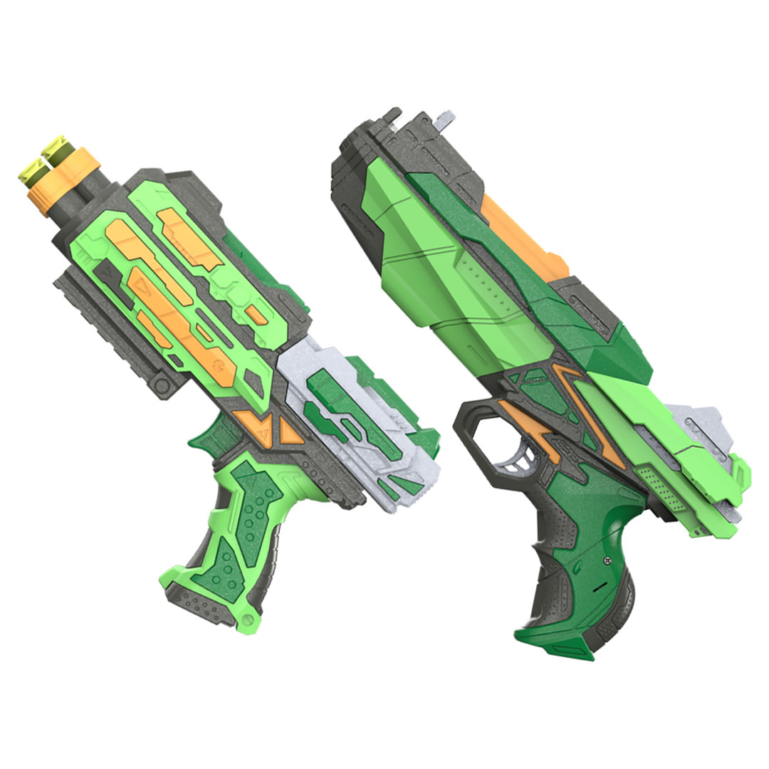The blaster is designed to provide an engaging and safe play experience with enhanced aiming and handling capabilities.