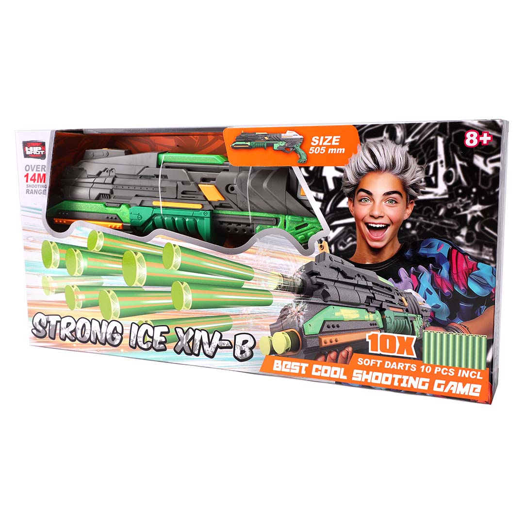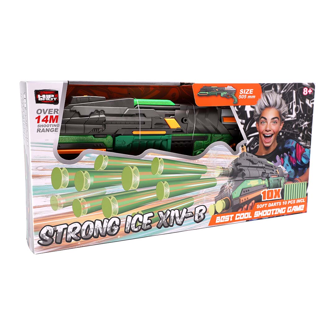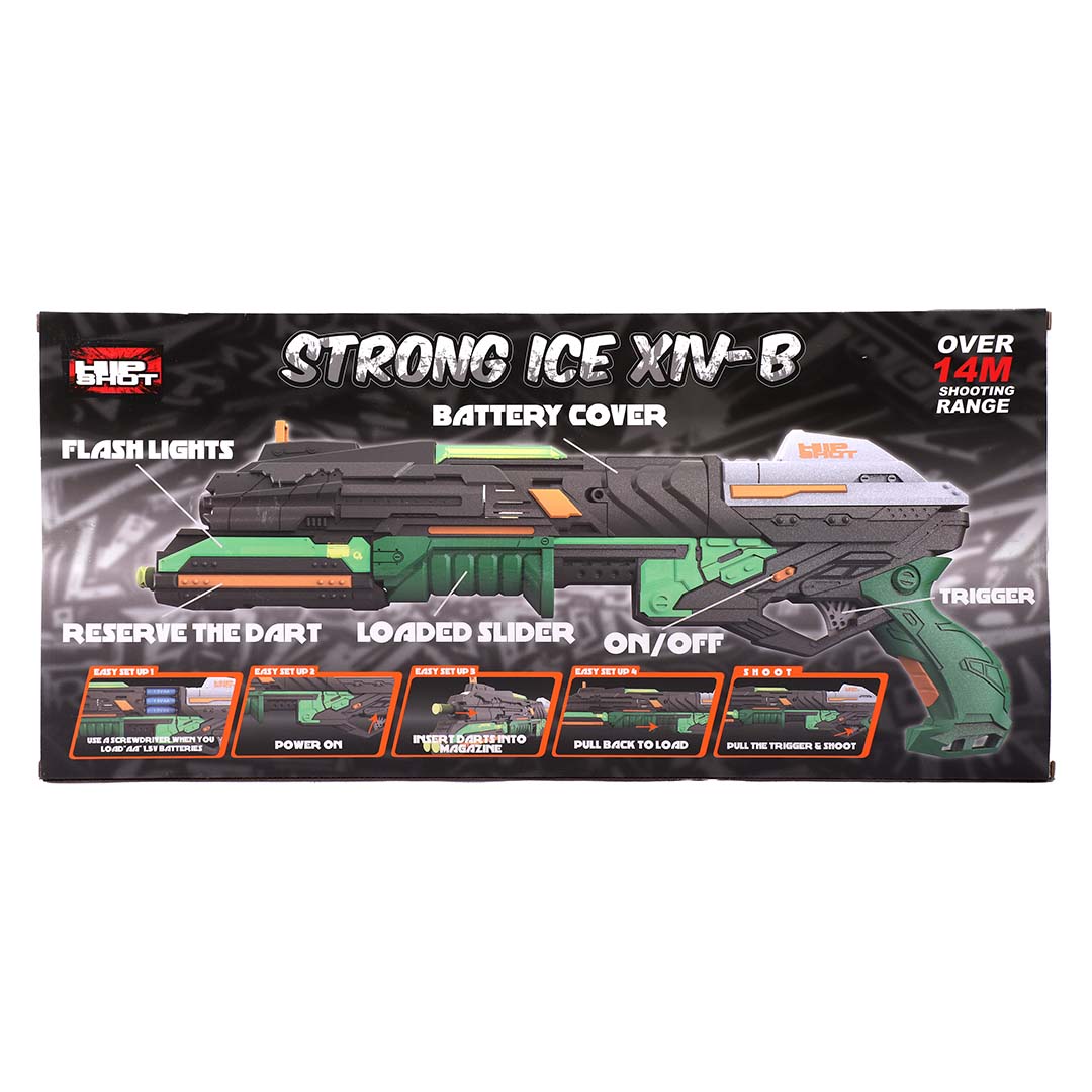 Dominate the battlefield with the Strong Ice XIV-B! Featuring flash lights and a loaded slider, and boasting a shooting range of over 14 meters, this blaster delivers unmatched power and precision. Get ready to take your game to the next level! Unleash the ultimate gaming experience with the Strong Ice XIV-B. With its reserve dart system, easy setup, and impressive 14+ meter range, this blaster offers hours of thrilling, non-stop action. Gear up and get ready for adventure!